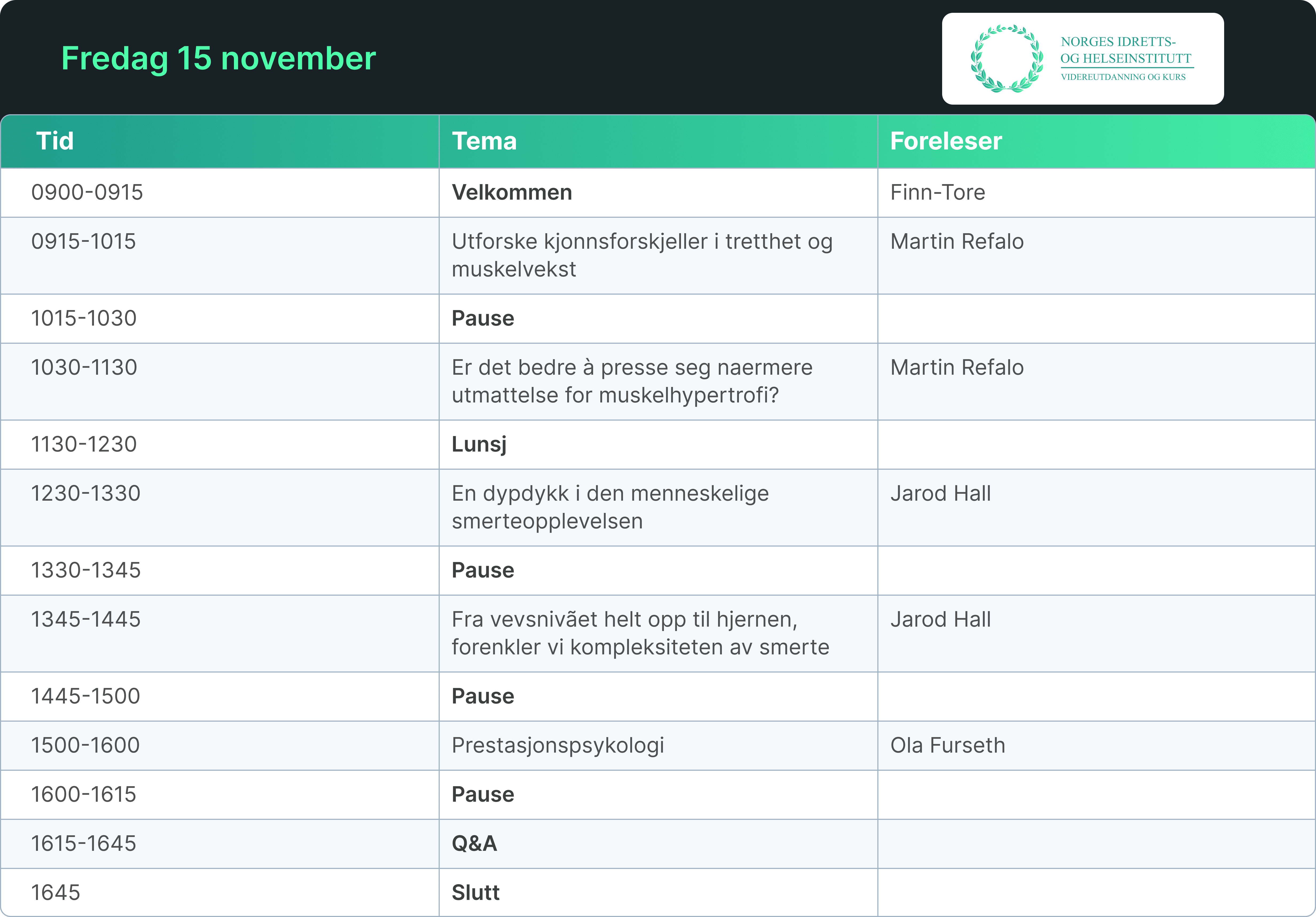 Vi har samlet noen av de fremste ekspertene innen helse og idrett, klare til å dele sin kunnskap og erfaring. Programmet tilbyr et variert spekter av foredrag og diskusjoner ledet av anerkjente fagpersoner fra hele verden.